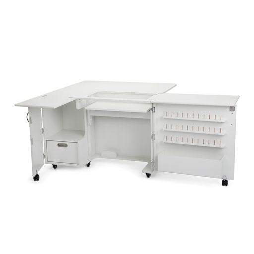 One of 3 signature sewing cabinets from Kangaroo Sewing Furniture, Wallaby is a dynamic, full-size sewing cabinet ready to elevate your sewing and quilting adventures! Wallaby features a 3 position hydraulic lift for free arm and flat bed sewing, and dynamic storage solutions for your serger, thread and other sewing notions! Wallaby’s expansive worksurface is highlighted by a foldable rear quilt leaf to keep large quilting projects from falling to the floor! Keep all of your sewing materials in immediate reach, and add style, comfort and convenience to your growing sewing studio!