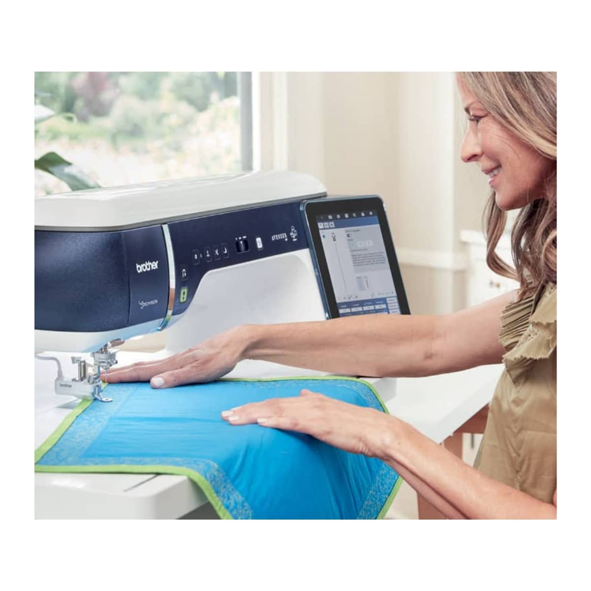 - Large Workspace, Embroidery and Projector Area An industry-leading 14.1” workspace (70 square inches) from needle to arm handles everything from large home décor projects to upcycled creations. The large 11 5/8” x 18 1/4” embroidery frame is the largest and most advanced embroidery frame ever offered by Brother. Project stitches or designs onto an 8” x 5” (127 x 203mm) projection area for precise placement and edit directly on fabric, such as moving, resizing, and rotating¹. When multiple designs are in place, selecting a specific object for editing is easy.