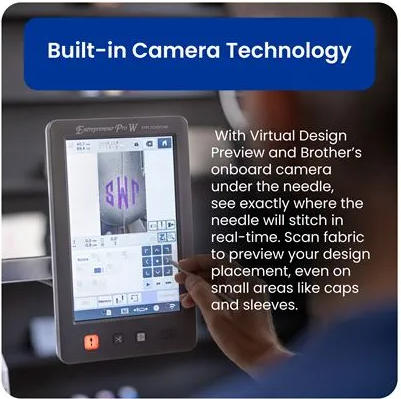 - Built-in Camera Feature Allows you to get a real time camera view of the needle. Virtually preview your design on fabric.