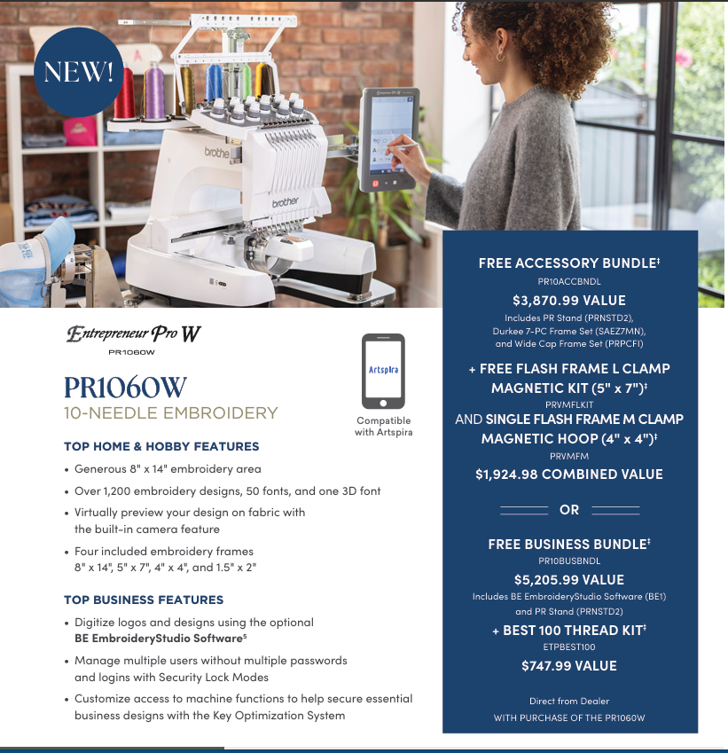 - Wireless Enabled The Entrepreneur Pro W PR1060W Embroidery Machine is designed with wireless capabilities¹, offering a highly flexible, connected, and streamlined user experience.