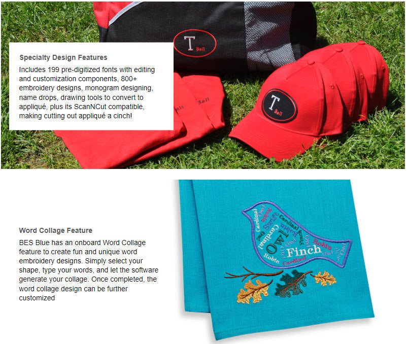 Perfect for the embroiderer looking to start their journey with Brother Embroidery Software. BES Blue has lots of Embroidery and lettering features such as on-screen typing, sewing order, font categories, fills and underlay, and more! Resize Embroidery designs and merge multiple designs on to one page. Specialty features include: 199 pre-digitized fonts with editing and customization features, 800+ embroidery designs, Monogram designing, name drops, drawing tools to convert to applique, PLUS, its ScanNCut compatible, making cutting out applique a cinch!