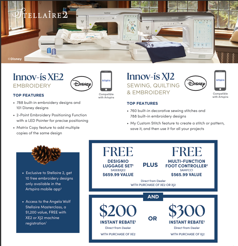 The modern Stellaire2 Innov-ís XE2 Embroidery Only Machine with Disney continues the Brother legacy of exceptional embroidery machines. With 788 embroidery designs, plus 101 Disney exclusive designs (for a total of 889), a large 9.5” x 14” embroidery area, and wireless integration with Artspira, the Stellaire2 Innov-ís XE2 will elevate your embroidery skills.
