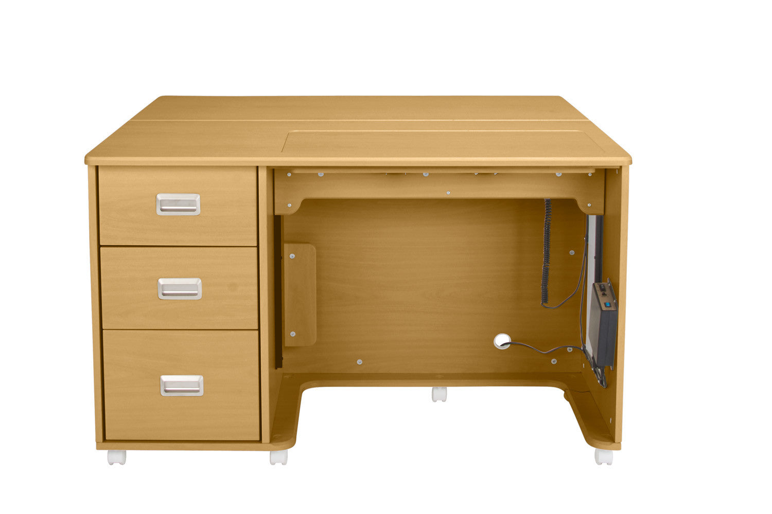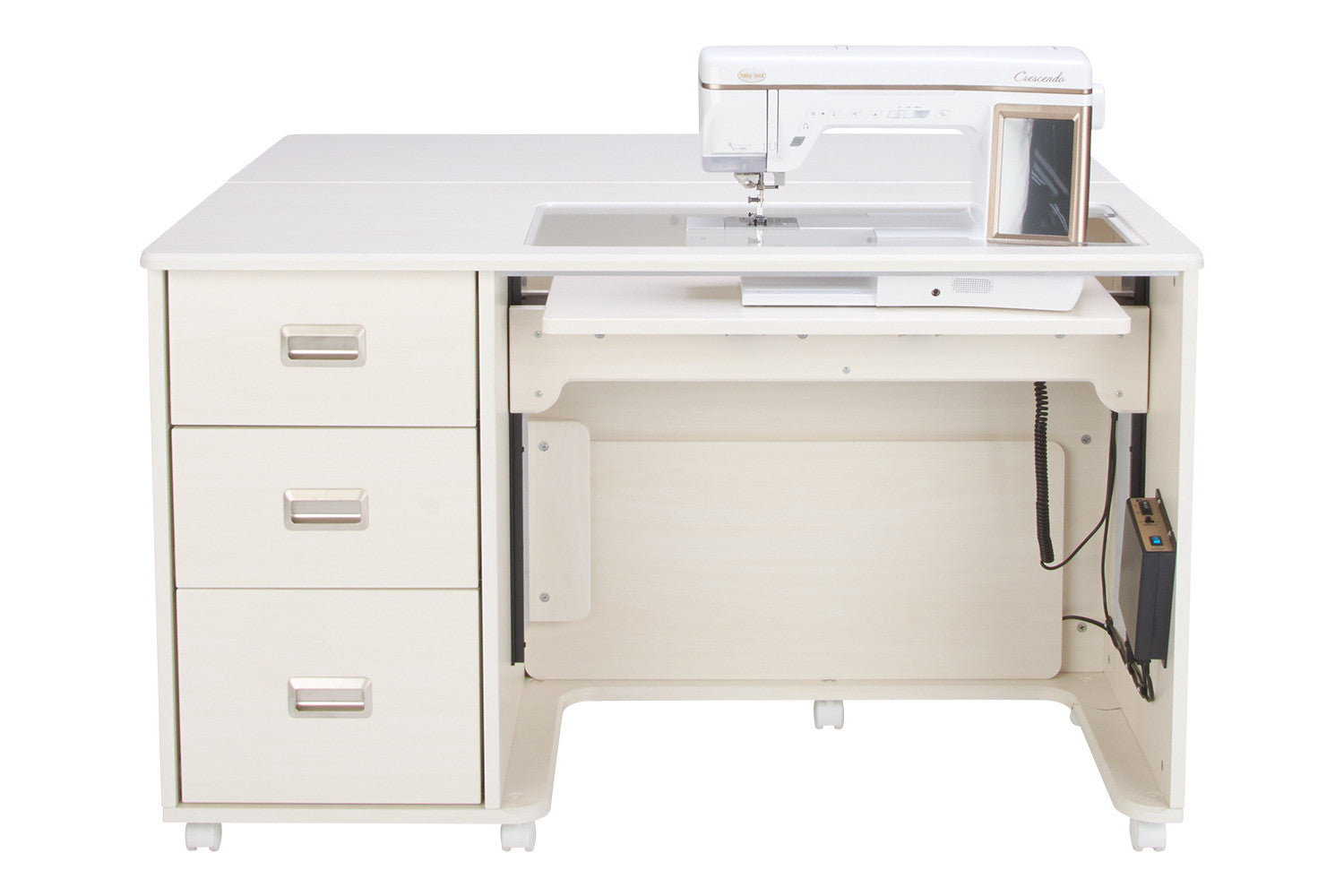 A top-of-the-line sewing machine cabinet, the Artistry Drawer Center combines comfort and luxury with essential sewing room organization and sewing storage to perfectly accommodate your machine, accessories, and notions. A remote-controlled lift and three soft-closing drawers give you the features you need to create the sewing studio of your dreams.