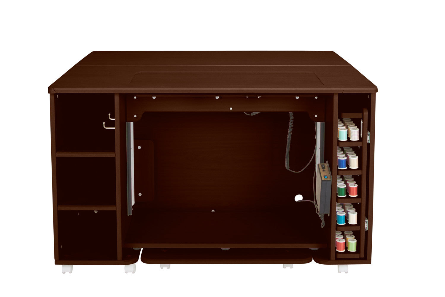 A luxury sewing machine table crafted from high-quality materials and packed with sewing storage, the Maker Center adds style and functional design to your sewing room. Adjustable shelving and a remote-controlled lift make it easy to customize your workspace to fit your unique creative and sewing storage needs.