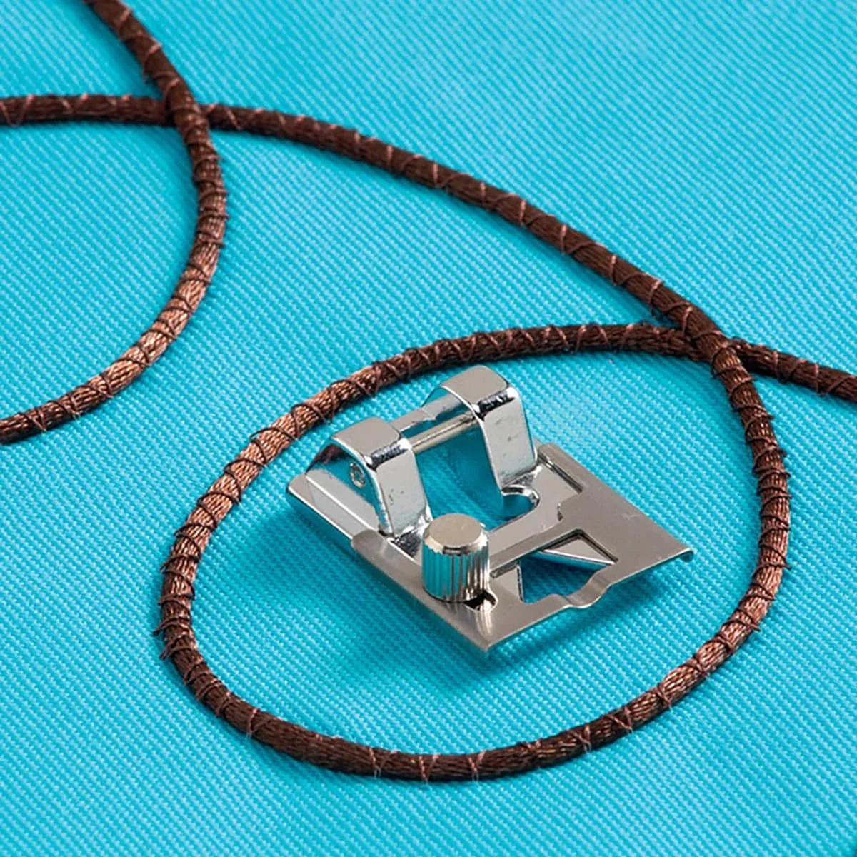 Used for both couching and stitching, this braiding foot is adjustable, which allows for greater flexibility in the width of the braid, cord, ribbon, or elastic being applied.