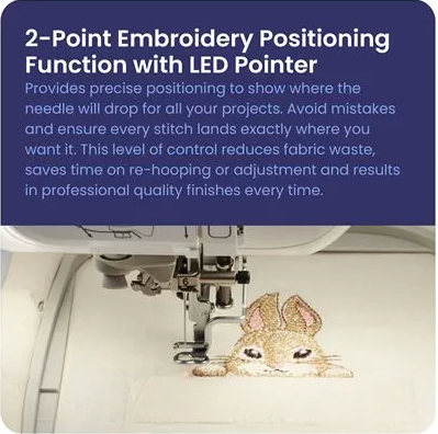 - 2-Point Embroidery Positioning Function The accurate and innovative 2-Point Embroidery Positioning Function will give you precise positioning of where the needle will drop for all your projects.