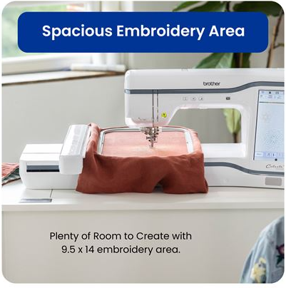 - Embroidery Area and More The Celeste CX1e has a maximum embroidery area of 9.5” x 14”, exceptional LED lighting, a clear and sharp 10.1” LCD digital display, and a number of cutting-edge apps for almost any project.