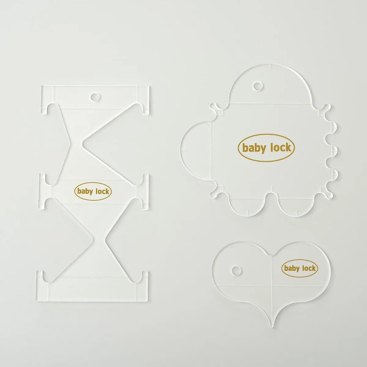 Baby Lock 1/4 inch Ruler Expansion Set - Expand your quilting capabilities with the Baby Lock Ruler Expansion Set. These templates are perfect for any sewer looking to add new designs and styles to their quilts. Set Includes: 3” Triangle Swag Chain, 4 Size Clamshell Ruler, and Mini Heart.